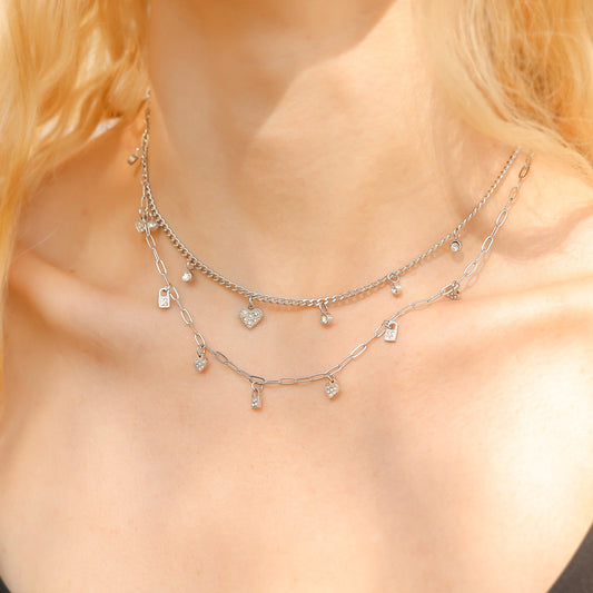 Stainless Steel 2 Row Heart & Lock Charm Necklace / CHN0069
