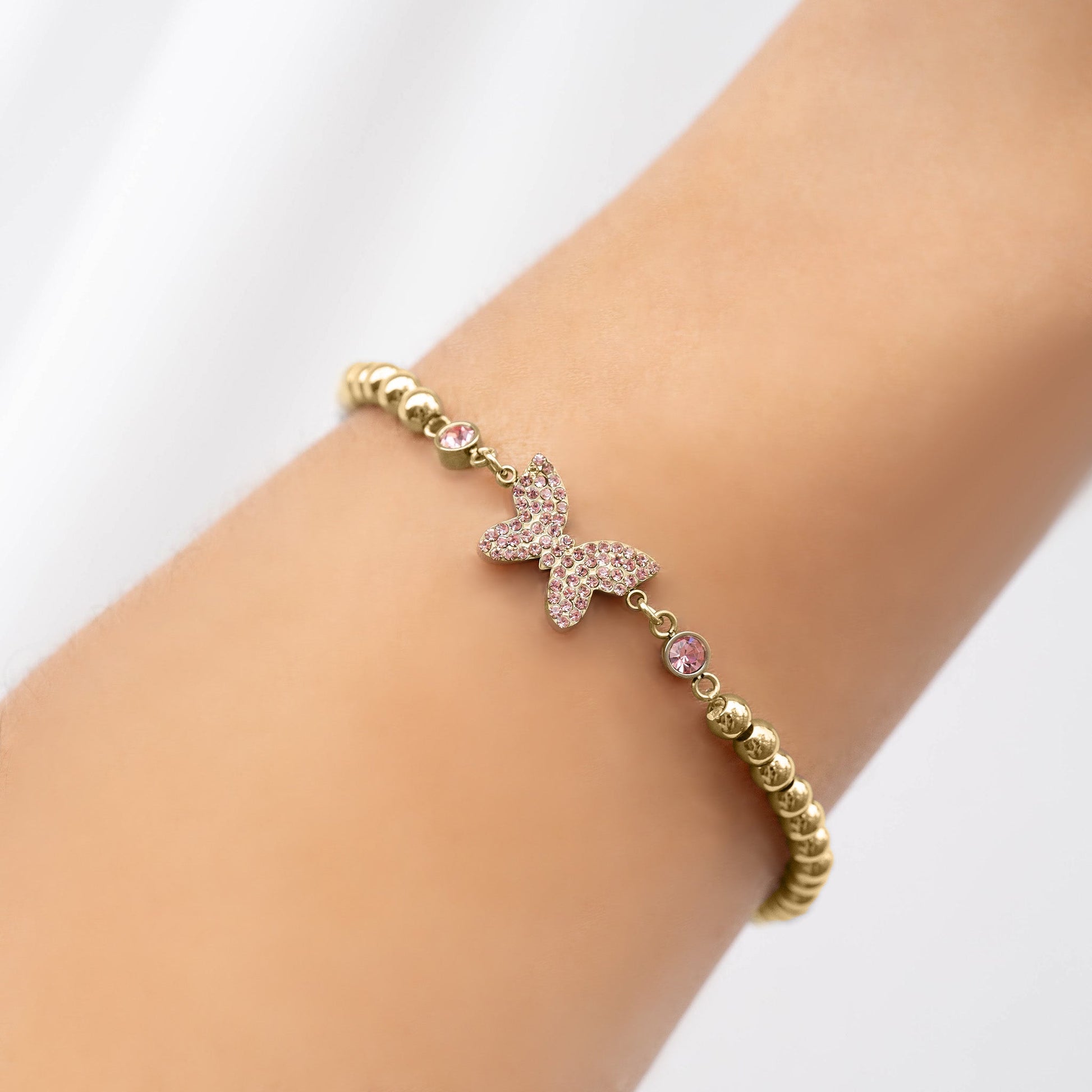 18K Gold PVD Stainless Steel Butterfly Stretch Bracelet, adorned with delicate pink stones. A harmonious blend of elegance and charm, this piece offers timeless beauty with a modern twist—perfect for effortless sophistication