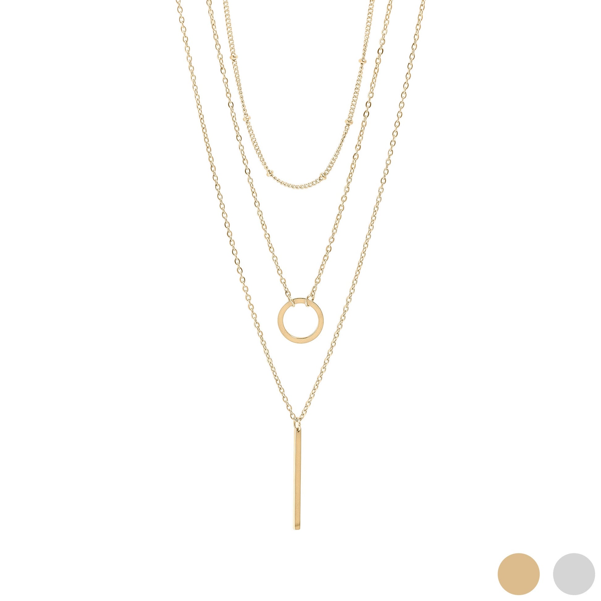 The Loop & Satellite 3-Row Layered Chain Necklace is a stunning everyday basic for every collection. Featuring 3 chains layered as a single necklace, this layered look is perfect for every season. Crafted from high-quality 18K Gold PVD as well as stainless steel, this layered necklace adds texture and interest to any outfit. Between this necklace's popular look and classic style, it is sure to be a top seller in any storefront or jewelry collection!