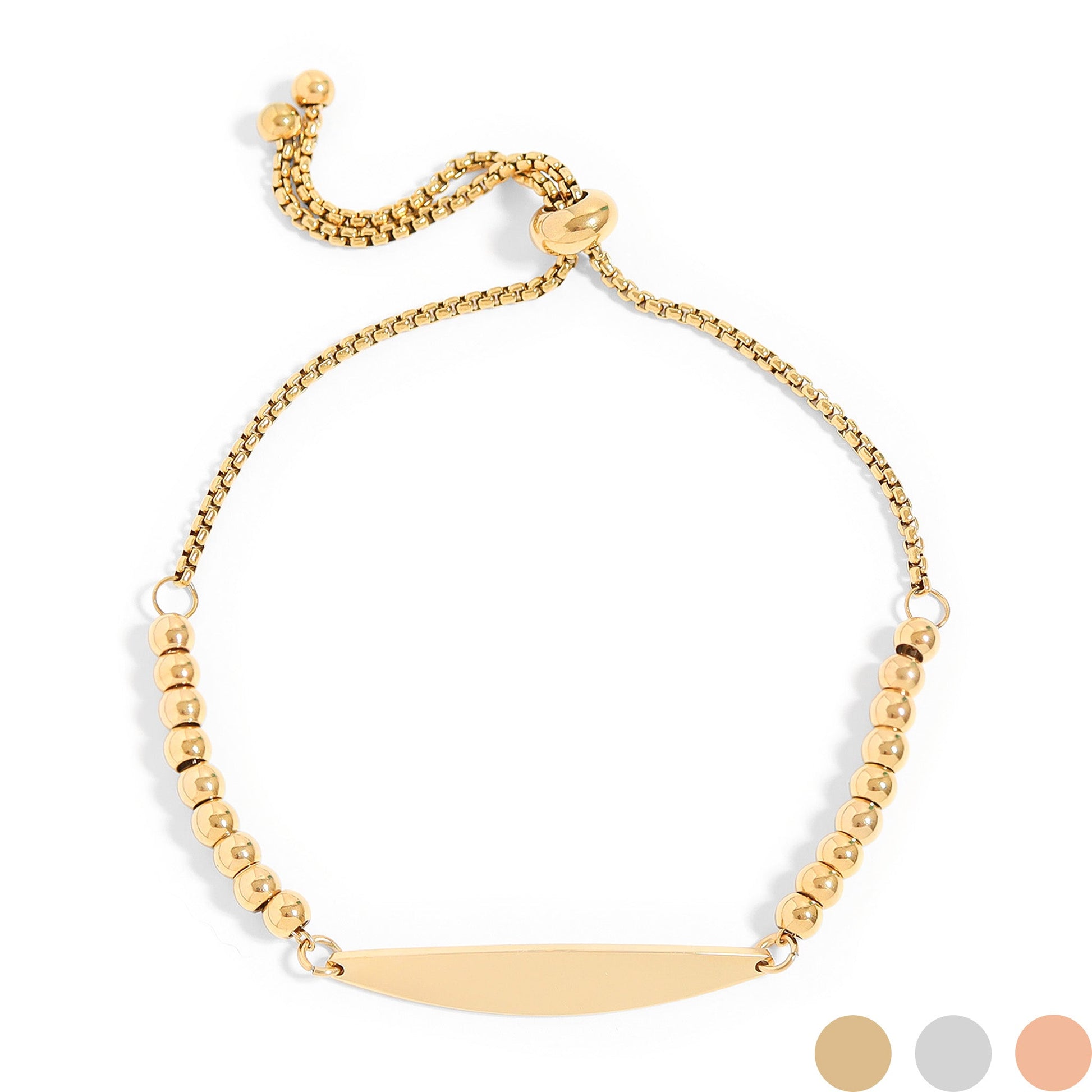 The Wholesale 18K Gold PVD Stainless Steel Adjustable Engravable Curved Bar Beaded Bracelet is made with a proprietary blend of 316L Surgical Steel.