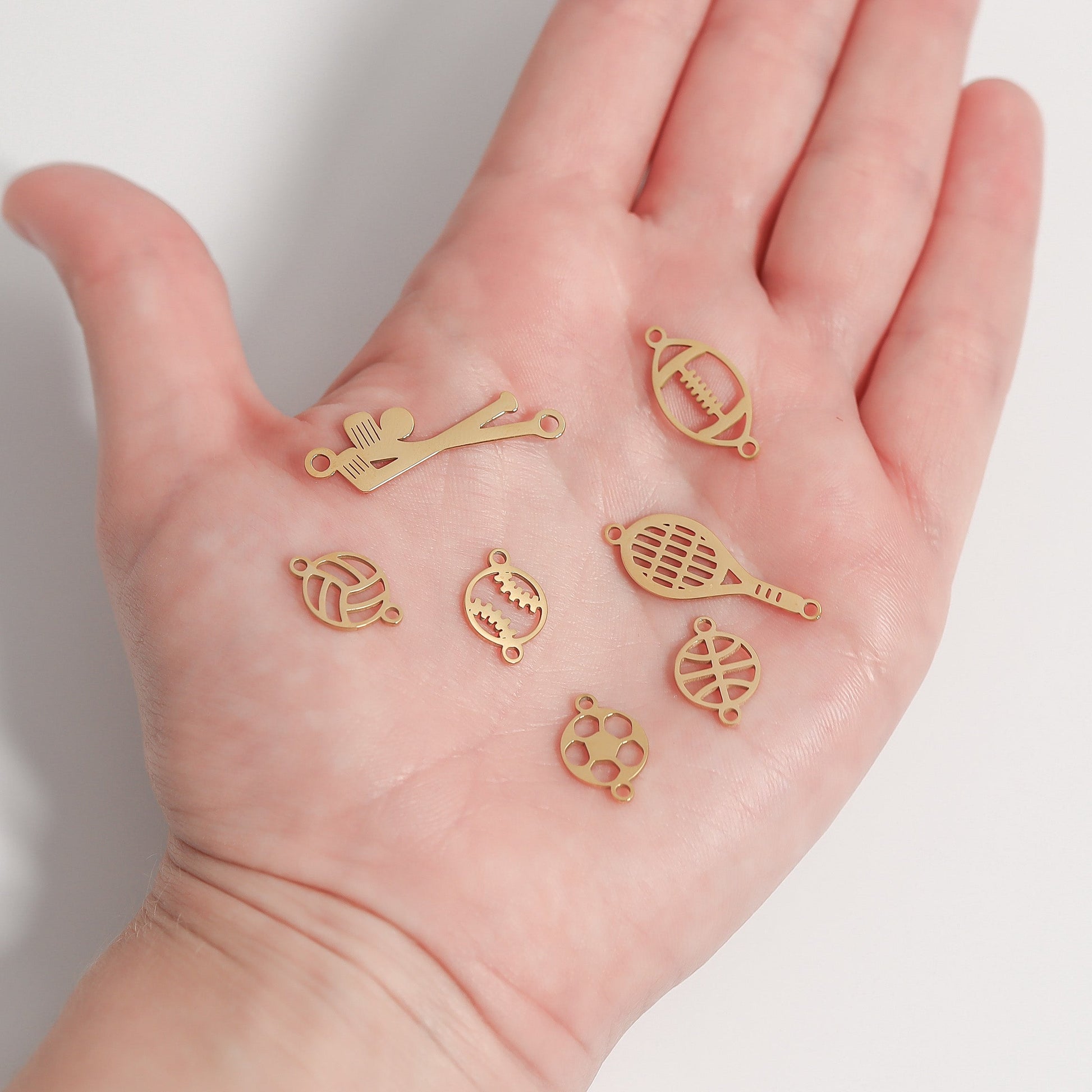 Take your jewelry game to the next level with our 18K Gold PVD stainless steel basketball connector charm! This charm is perfect for any basketball lover. This connector charm can easily be added to any chain creating the perfect necklace or bracelet to let your customers express their support for their favorite team. Crafted from durable stainless steel and beautifully finished in 18K Gold PVD, this charm is designed to shine on and off the court.