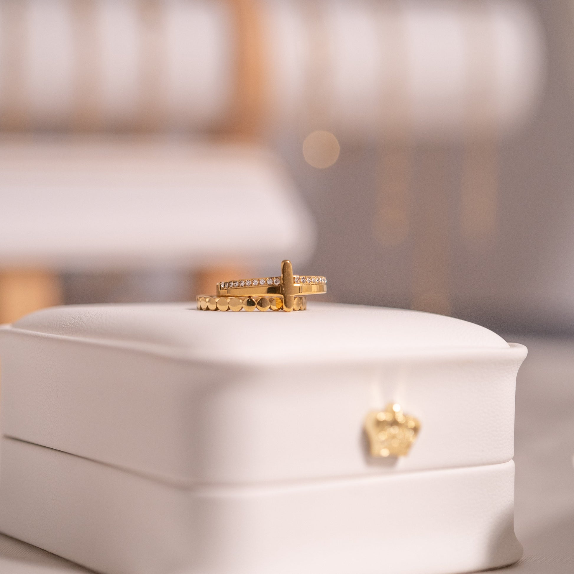 • The 18K Gold PVD Stainless Steel Cross CZ Stone Engraved Stacking Ring is strong, durable, and doesn't easily break.