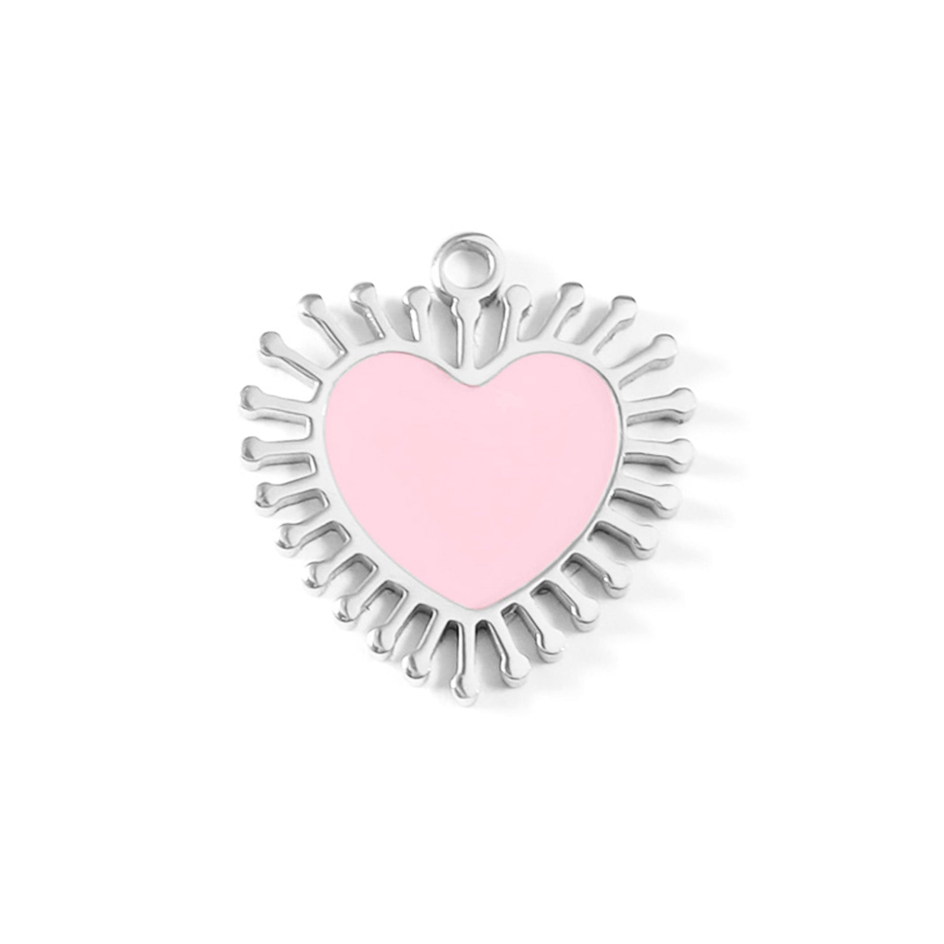 A beautiful symbol of love to add to your jewelry, our NEW 18K Gold PVD Stainless Steel Pink Sun Ray Charm is a must have for your charm collection! Featuring a stunning pink epoxy heart with sun ray accents around the heart. This charm is the perfect sentimental accent to add to your necklaces and bracelets, this heart charm is a great reminder your customers can wear daily to make their jewelry more than just a fashion accessory. Made with our proprietary blend of 18K Gold PVD coated surgical-grade stainless steel designed for everyday wear, your customers have quality, style, and comfort they can cherish for years to come!