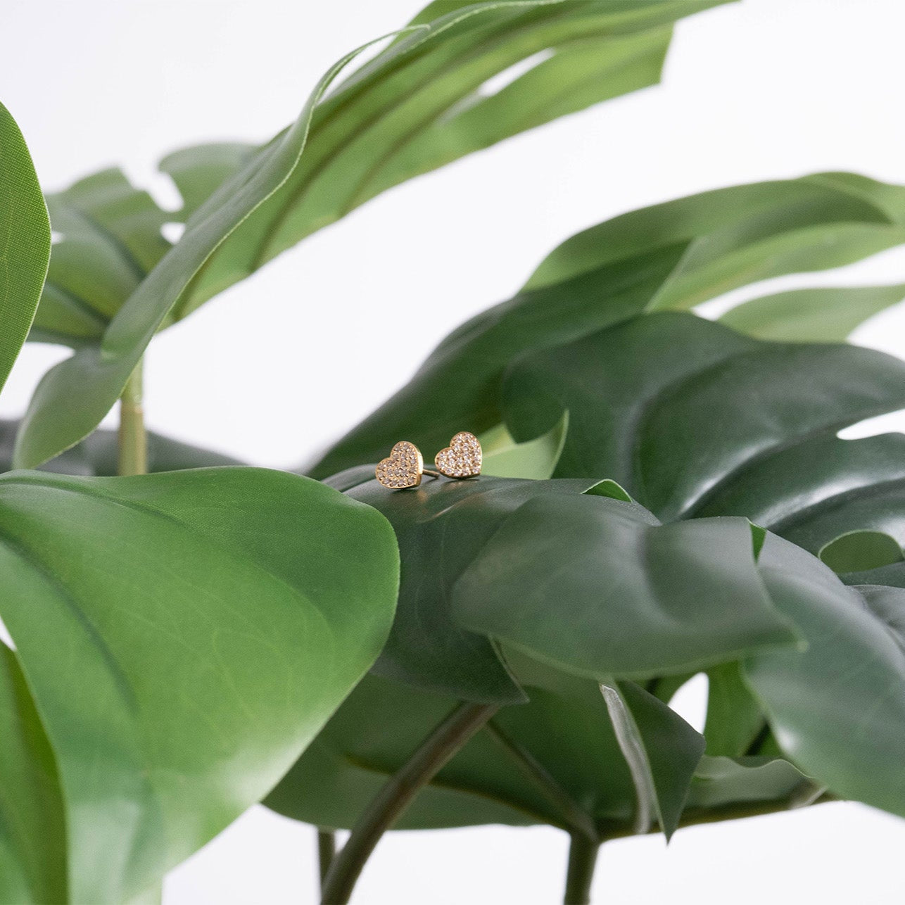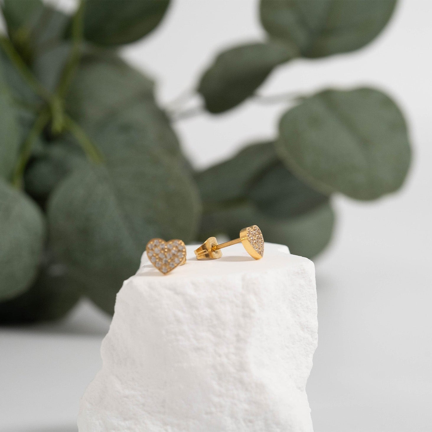 Fall in love with the subtle sparkle of these heart-shaped stud earrings. Made from durable stainless steel and finished in rich 18K gold PVD plating, these romantic studs are adorned with brilliant pavé-set stones that add a delicate shimmer to any look. Designed to be both hypoallergenic and tarnish-resistant, they’re perfect for everyday wear or a special gift.