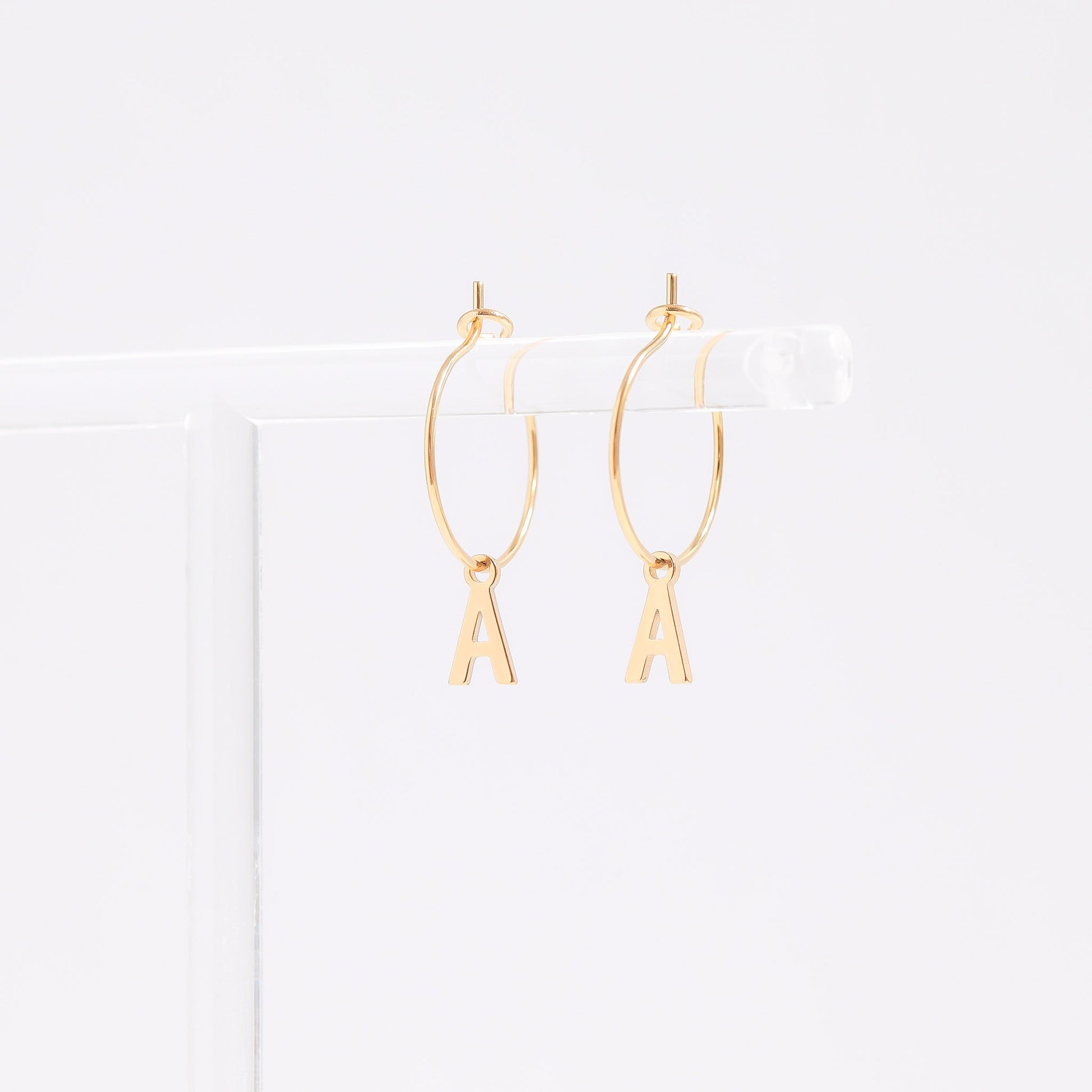 The classic hoop style features a dainty letter charm, for the perfect and specific jewelry piece. Crafted from high quality 18K Gold PVD and stainless steel these earrings will look perfect in a storefront, jewelry store, or personal collection. Customers will love the personable connection that these earrings create.
