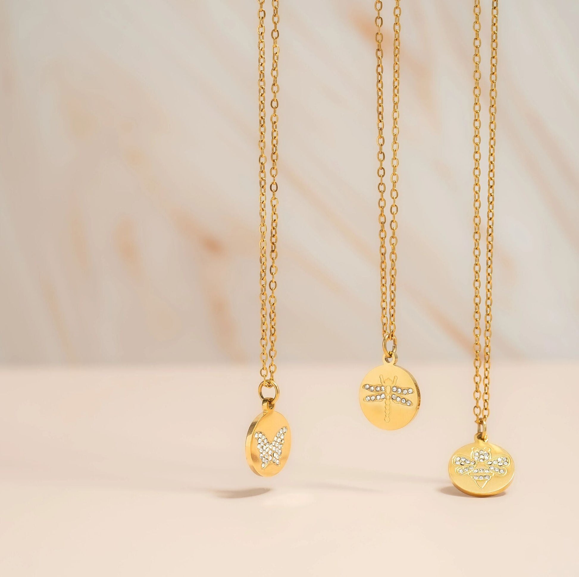 Add a touch of sophistication and symbolism to your jewelry collection with our 18K Gold PVD Stainless Steel Stone Dragonfly Pendant Necklace. Adorned with shimmering stones, this exquisite piece captures the grace and beauty of nature. The intricate design and luxurious gold tone create a timeless piece that's perfect for both casual and formal occasions!