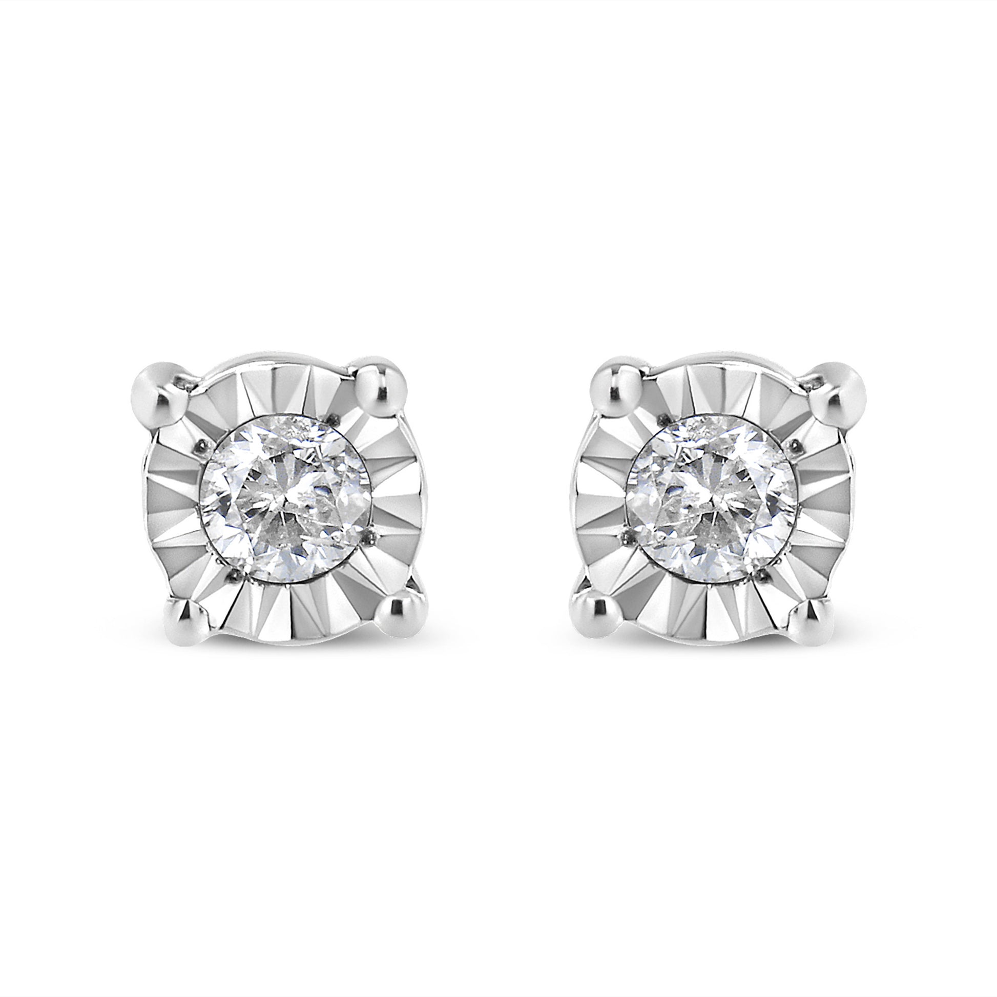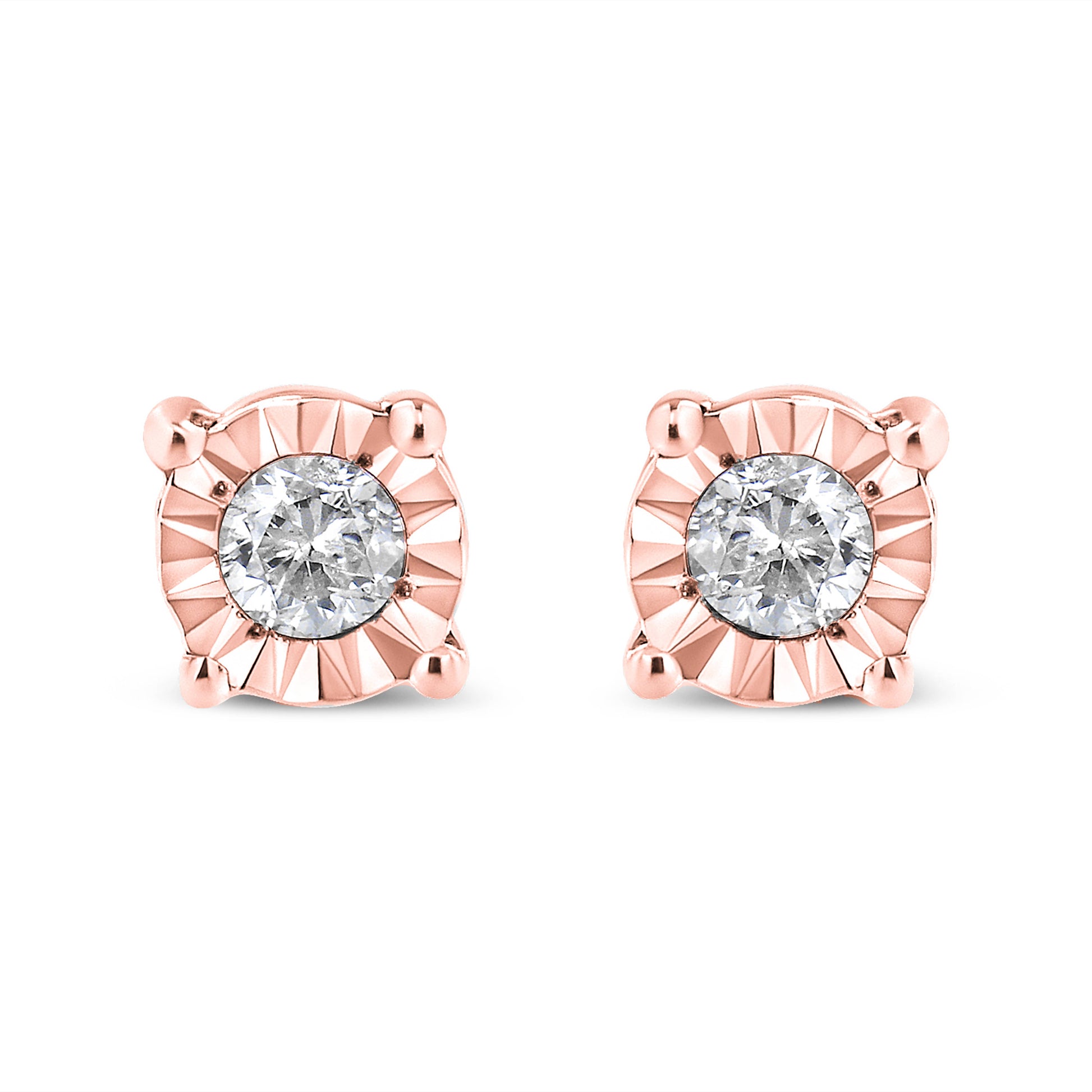 Verleihen Sie Ihrer Garderobe mit diesen eleganten und extravaganten Diamantohrringen einen schimmernden Touch. Die Ohrringe sind in runder Form gefertigt und bestehen aus Sterlingsilber Ihrer Wahl, das mit weißem Rhodium beschichtet ist, oder aus 10-karätigem Rosé- oder Gelbgold-Galvanik. Jeder der Ohrstecker besticht mit einem Wunder plattierten Diamanten im Rundschliff, der die Illusion eines größeren Diamanten vermittelt und sie zum Leuchten bringt, als ob unzählige Sterne am Himmel glitzern. Sie haben die Wahl zwischen 1/10 Karat Gesamtgewicht oder 1/5 Karat Gesamtgewicht. Spezifikationen des Produkts: Diamantform: Natürlicher runder Diamant Diamantfarbe: I-J Reinheit des Diamanten: I3 Metallart: rhodiniert .925 Sterling Silber Diamantenfassung: Wunderplatte Gesamtgewicht des Diamanten: 1/10 Karat oder 1/5 Karat