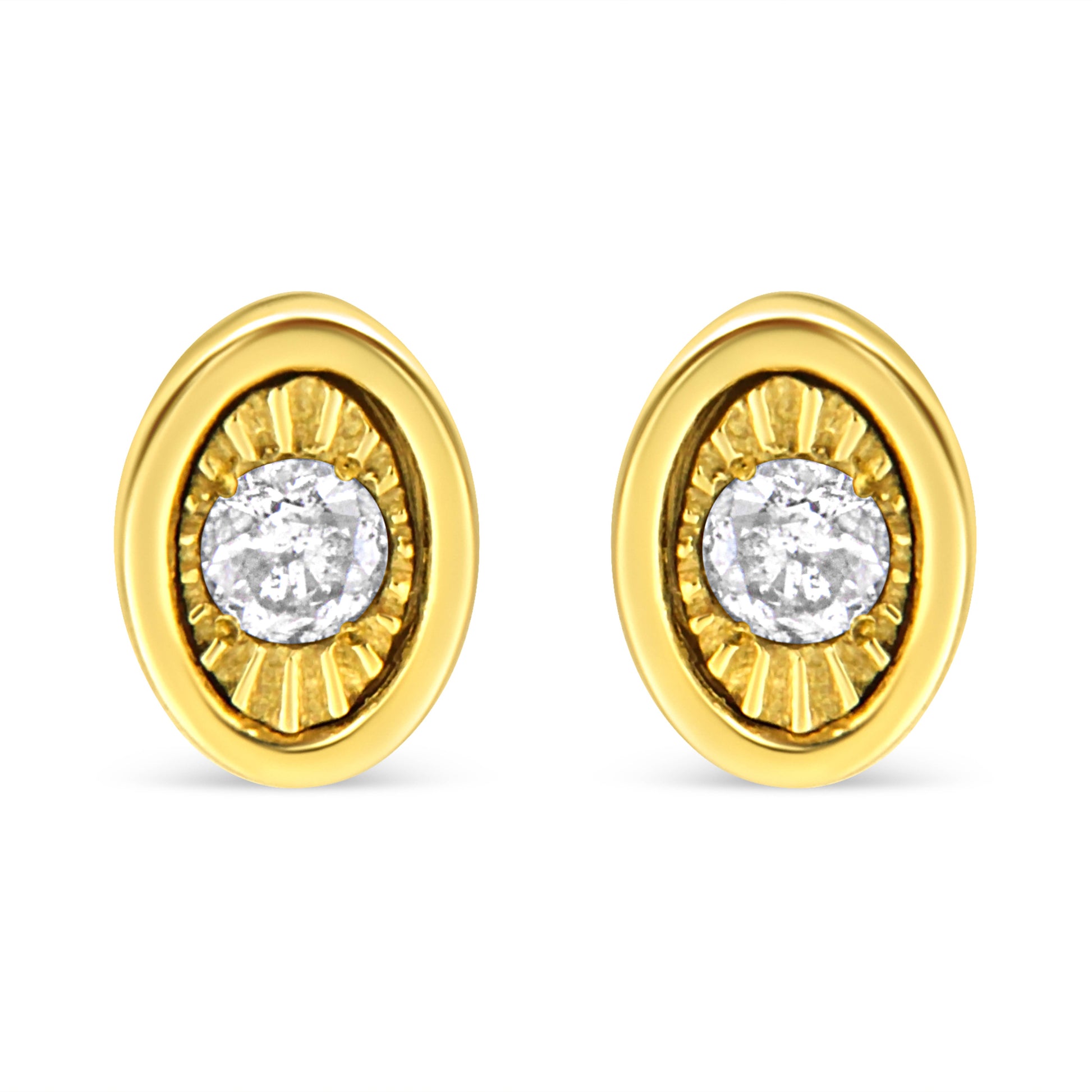 10K Gelbgold plattiert .925 Sterling Silber 1/10 Cttw Miracle-Set Diamant Ovale Form Ohrstecker (K-L-Farbe, I2-I3-Klarheit). Diese ovalen Ohrstecker sind aus mit 10 Karat Gelbgold vergoldetem Sterlingsilber gefertigt und verfügen über 1/10 Karat TDW Diamanten. Jeder Ohrring verfügt über einen einzelnen funkelnden Diamanten im Rundschliff in einer Wunderfassung, die den Ohrringen Glanz verleiht. Ein poliertes warmes Gelbgoldband bildet einen Rahmen um den Ohrring. Diese Stollen werden mit einem Rückdrückmechanismus gesichert. Gesamtabmessungen: 16 x 4 x 4. Gewicht des Produkts: 0,666 Gramm.