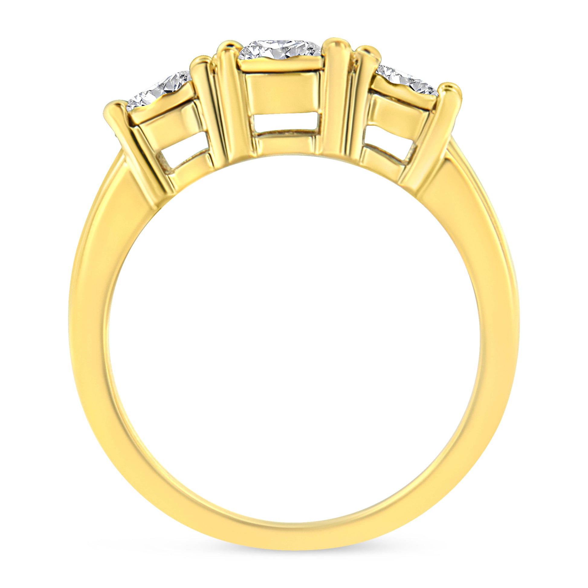 14K Gelbgold plattiert .925 Sterling Silber 1.00 Cttw Miracle-Set-runder Diamant-Dreistein-Verlobungsring (K-L Farbe, I1-I2 Klarheit). Elegant und zeitlos wurde dieser Verlobungsring mit einer Drei-Stein-Fassung in wunderschönem, glänzendem 925er-Sterlingsilber mit 14k Gelbgold neu gestaltet. In der Mitte dieses Stücks befindet sich ein Diamant im Rundschliff, flankiert von zwei kleineren Diamanten im Rundschliff, alle in einer auffälligen Wunderplattenfassung. Dieser beeindruckende Ring hat ein Gesamtkaratgewicht von 1 cttw und ist der perfekte Ring, um einer besonderen Person in Ihrem Leben Ihre Liebe zu präsentieren. Gesamtabmessungen: 21 x 7 x 21. Produkt Gramm Gewicht: 4,23.