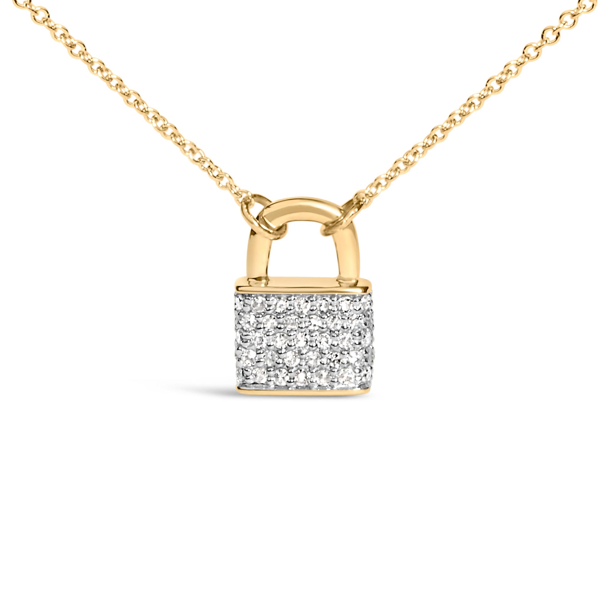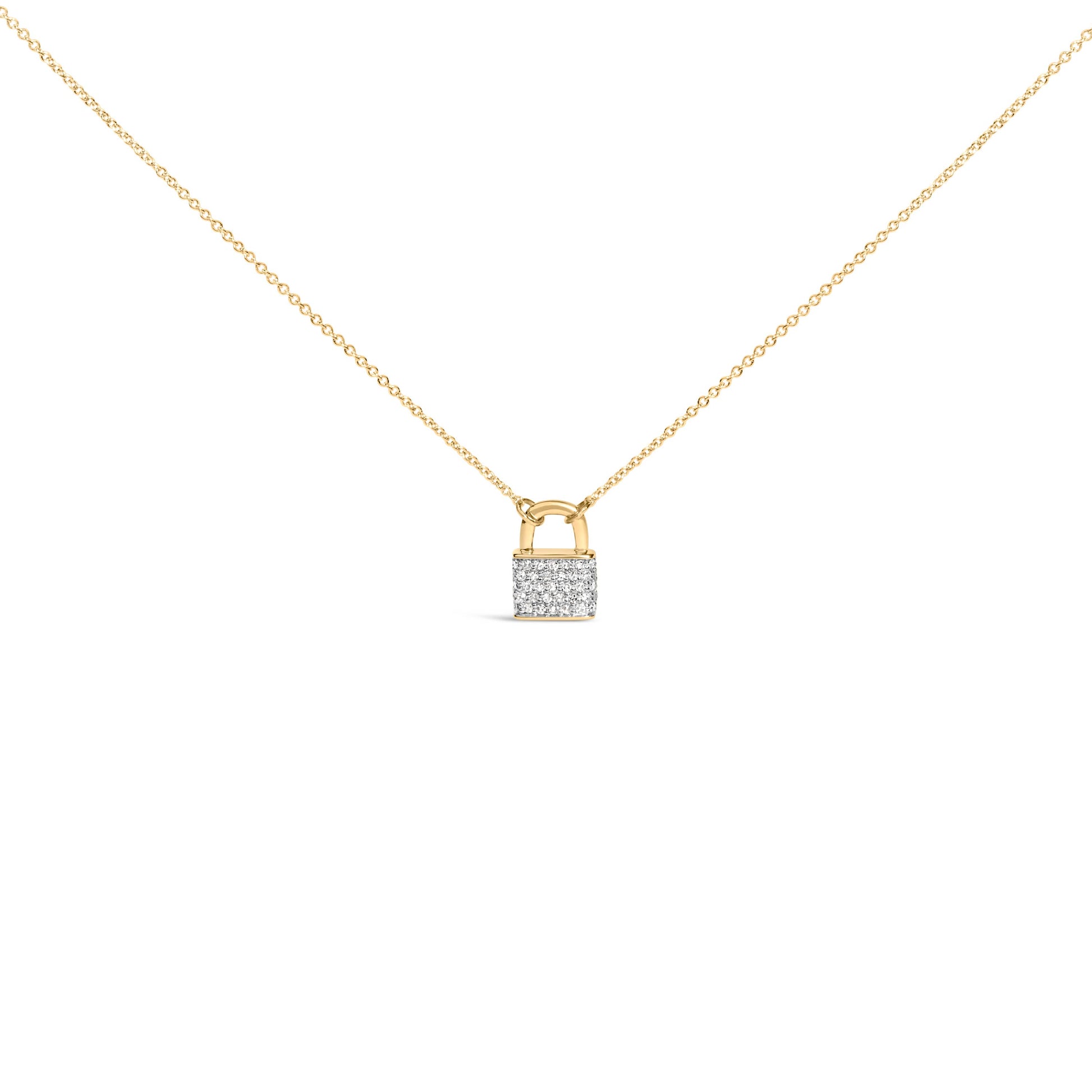 14K Gelbgold 1/6 Cttw Diamant-Schloss-Anhänger 18" Halskette (I-J Farbe, I1-I2 Reinheit). Entdecken Sie die Essenz der Eleganz mit dieser exquisiten, schlossförmigen Anhängerkette, die sorgfältig aus strahlendem 14K Gelbgold gefertigt ist. Funkelnd mit natürlichen Diamanten, die insgesamt 1/6 Karat wiegen, strahlt jeder Stein mit einer I-J Farbe und I1-I2 Reinheit und verkörpert eine Mischung aus Klarheit und Brillanz. Anmutig hängend an einer 18-Zoll-Kabelkette, die durch einen zuverlässigen Federringverschluss gesichert ist, findet dieser Anhänger eine zarte Balance zwischen Einfachheit und Opulenz. Sein dezentes Design ergänzt nicht nur die tägliche Garderobe, sondern wertet auch Abendkleidung auf und macht es zu einer vielseitigen Ergänzung jeder Schmucksammlung. Schätzen Sie dieses Symbol der Liebe und des Engagements, ein zeitloses Accessoire, das Charme und Stil einschließt. Gesamtabmessungen: 203 x 7,88 x 11,49. Produktgewicht in Gramm: 2,61. SKU: 94-2796YDM.