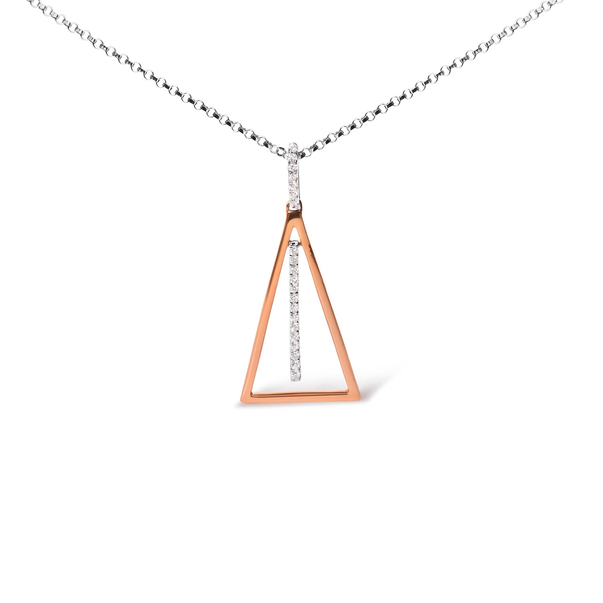 Windspiel-Halskette mit 18-Zoll-Anhänger aus 14-karätigem Rosé- und Weißgold, 1/8 Diamant (G-H, SI1-SI2). Entdecken Sie die heitere Eleganz dieser zweifarbigen Halskette mit Anhänger aus 14-karätigem Rosé- und Weißgold, bei der Kunst auf Faszination in einer Symphonie aus Edelmetallen trifft. Das Stück zeichnet sich durch eine exquisit gefertigte offene dreieckige Silhouette aus Roségold aus, in der ein senkrechter Balken tanzt, der reich mit natürlichen Diamanten geschmückt ist und die Farbe G-H und die Reinheit SI1-SI2 aufweist. Diese funkelnde Bar bewegt sich frei und ahmt das zarte Schwingen eines Windspiels nach. Sie fängt Licht ein und wirft faszinierende Schatten, die Ihre angeborene Raffinesse widerspiegeln.