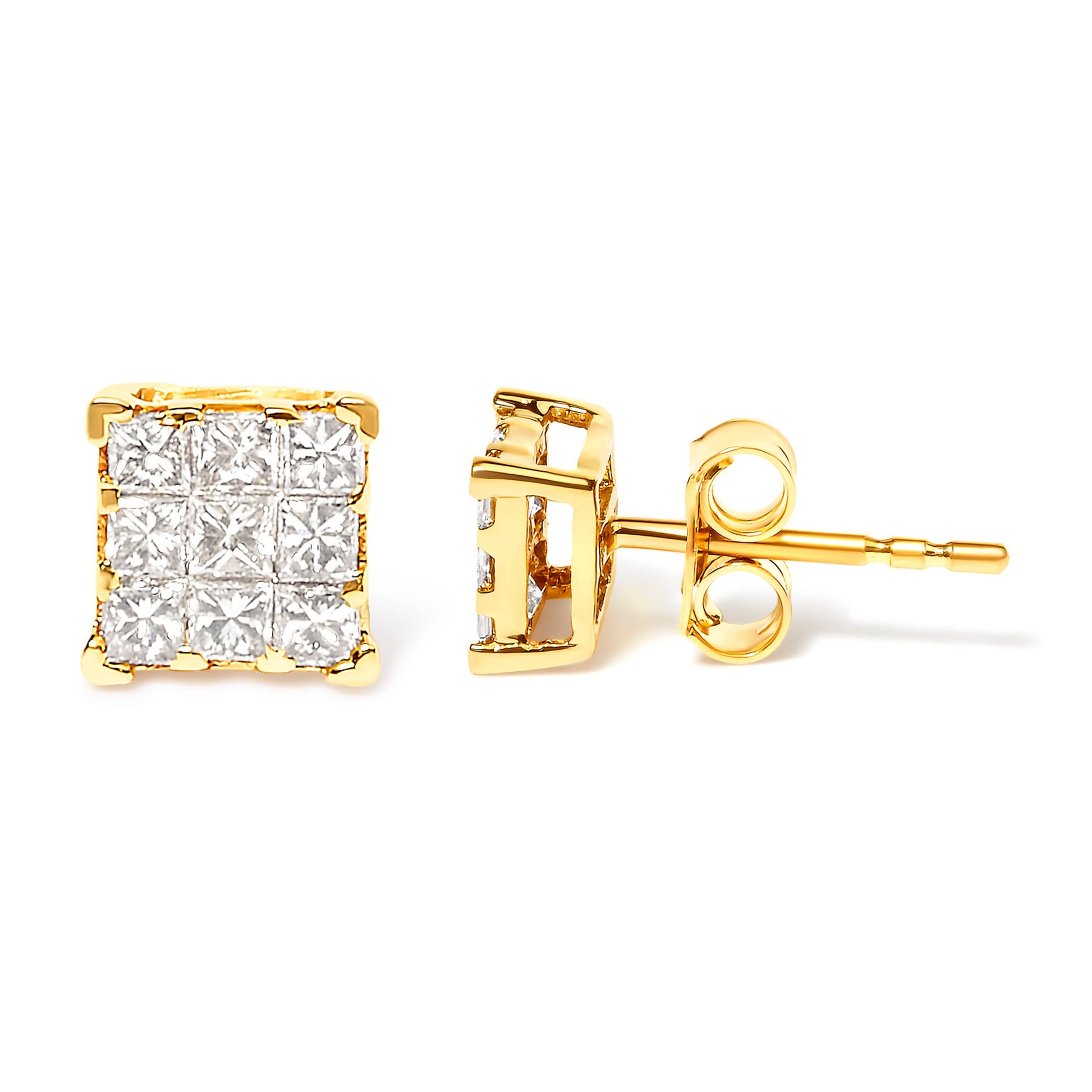 14K Gelbgold 1/2 Cttw Unsichtbar gefasste Prinzessschliff-Diamant 9 Stein Quadrat Ohrstecker (J-K Farbe, SI2-I1 Reinheit). Entdecken Sie die dezente Eleganz dieser exquisiten Ohrstecker, gefertigt aus strahlendem 14K Gelbgold und hervorgehoben durch die Brillanz natürlicher Prinzessschliff-Diamanten. Jeder Ohrring zeigt ein Cluster von neun Diamanten, insgesamt ein halbes Karat, unsichtbar gefasst, um das glanzvolle Erscheinungsbild eines einzigen, weitläufigen Steins zu präsentieren. Mit einer subtilen J-K Farbe und SI2-I1 Reinheit fangen diese Edelsteine bei jeder Bewegung das Licht ein und reflektieren es, wodurch ein Hauch von Raffinesse und Klasse entsteht.