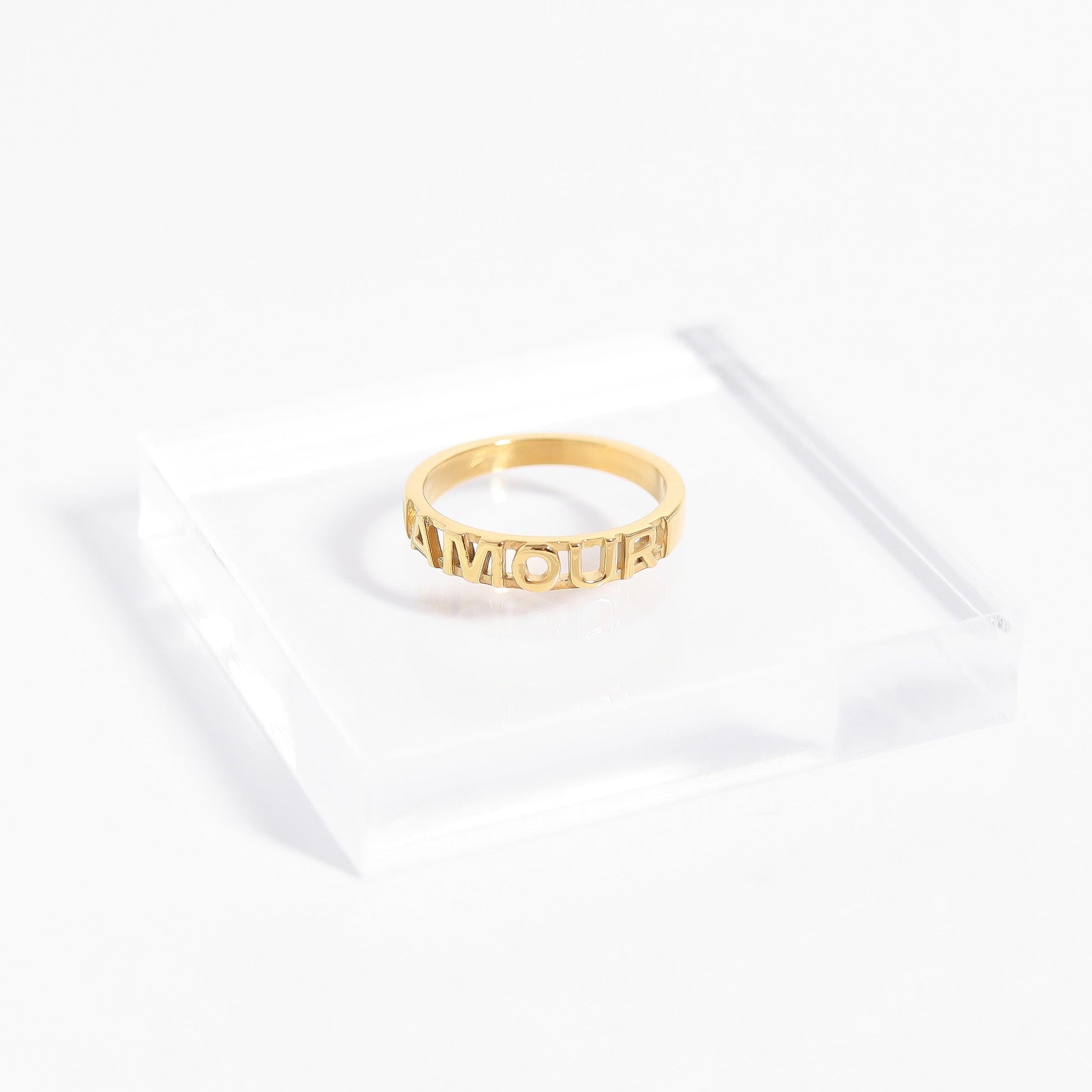 The Amour Stacking Ring is more than just a piece of jewelry, it's a timeless symbol of love, commitment, and connection. The word "Amour", French for love, is sculpted out of the band that makes this ring even more of a perfect token of affection and devotion. The stacking ring design allows for wearers to create personalized looks by layering it with other adored rings. Ideal for gifting on special occasions or as a daily reminder of affection, this ring combines exquisite design with deep meaning, making it an irresistible addition to any jewelry collection!