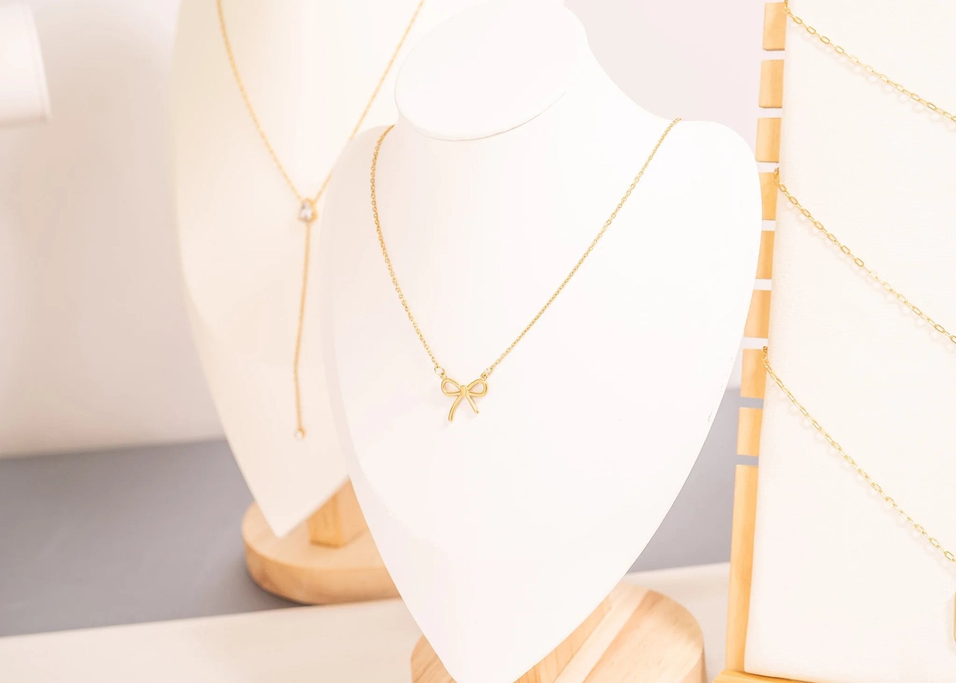 We use the process of PVD Coating our 18K Gold jewelry over 316L surgical grade stainless steel for a non-tarnish, hypoallergenic, polished finish that will hold up best to everyday wear and will never turn your customer's skin green.