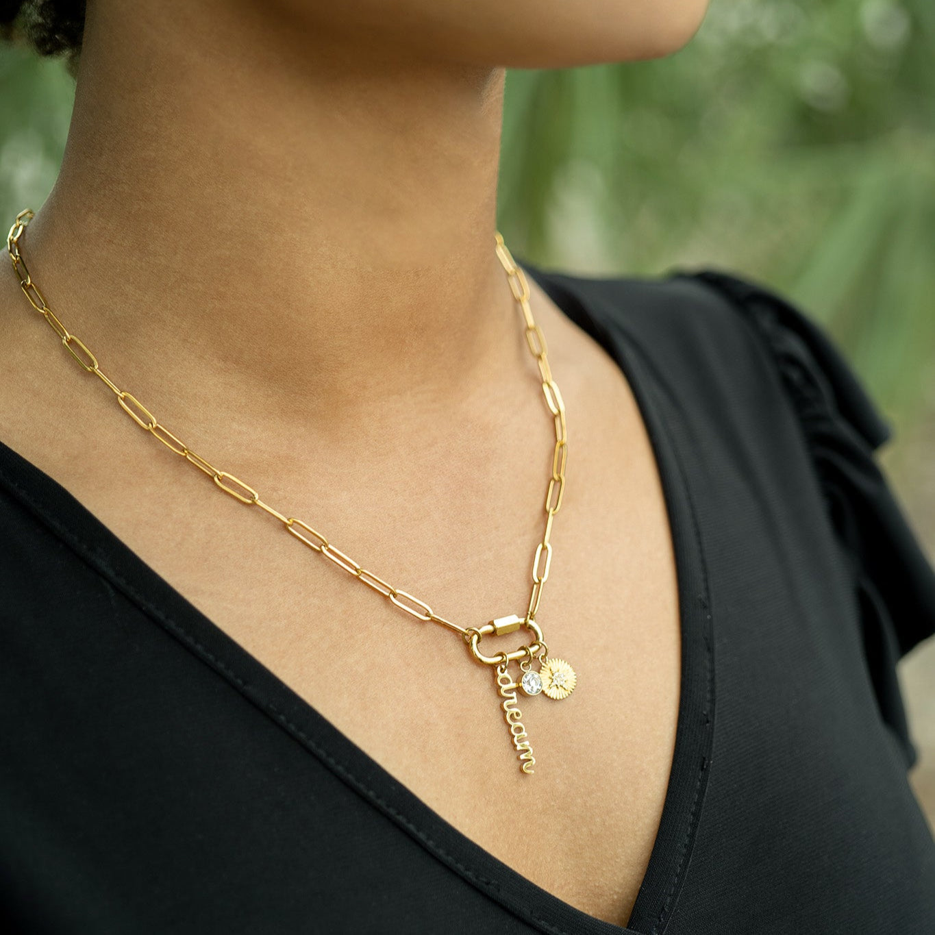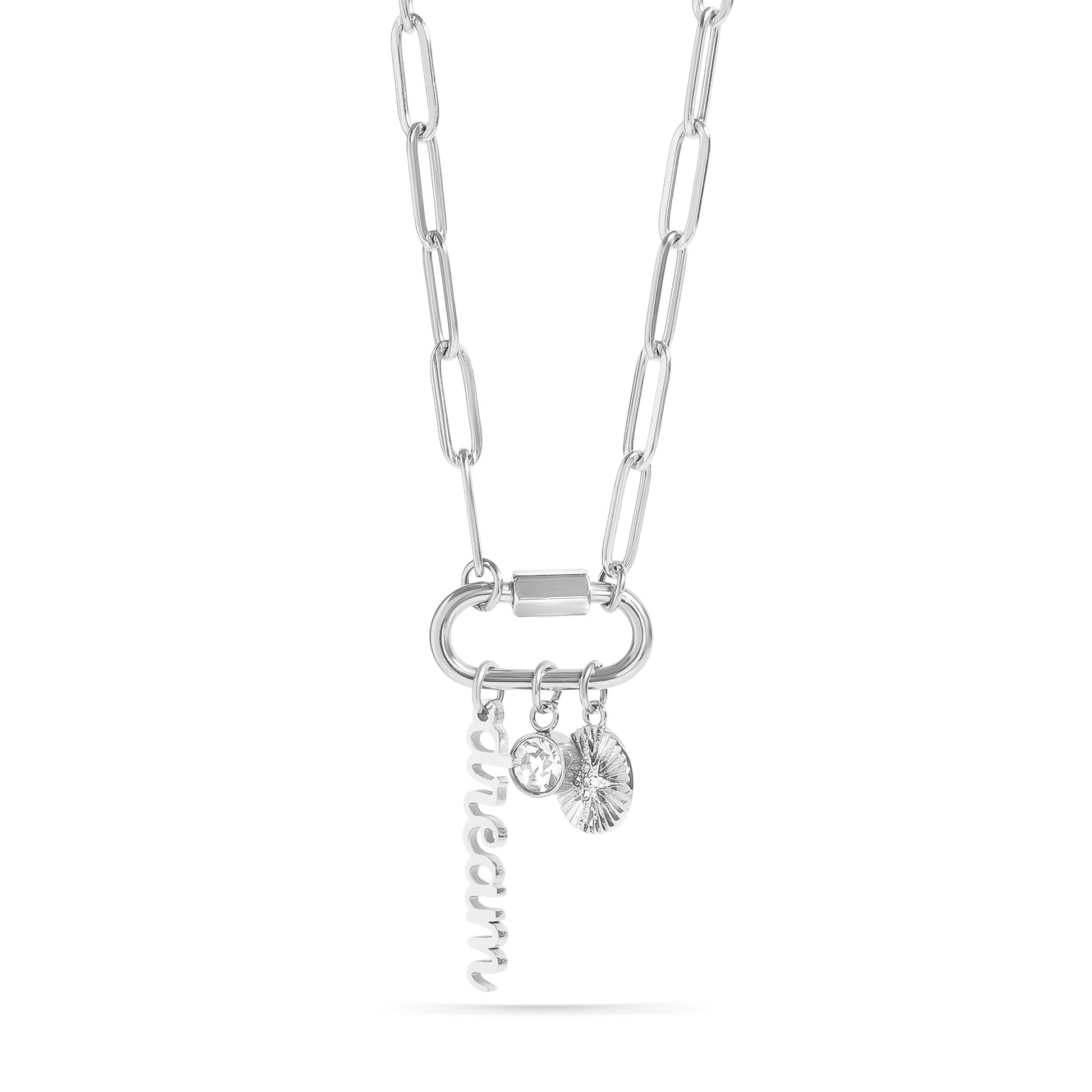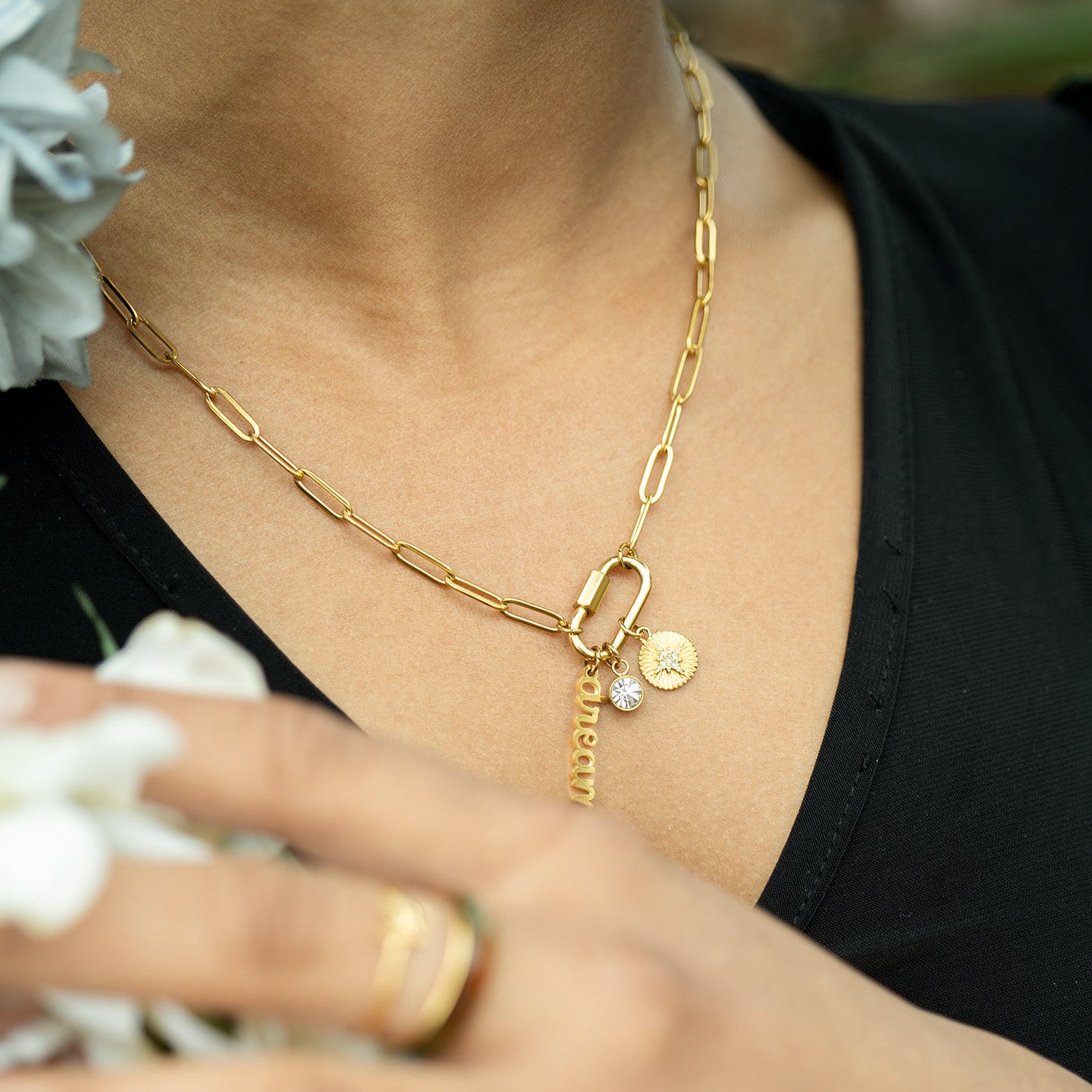 Description: What is the most stylish way to wear the charm necklace trend? Wear perfectly curated Stainless Steel Dream Charms on a Carabiner Charm Keeper. The charm keeper is featured on an 18" paperclip chain. This charm necklace includes a dream script charm, a bezel set clear stone, and a sunburst North Star Compass charm with a clear stone at the center. The carabiner charm keeper is functional so you can add or take off charms to create your own look. Available in both Stainless Steel and 18K Gold over Stainless Steel.