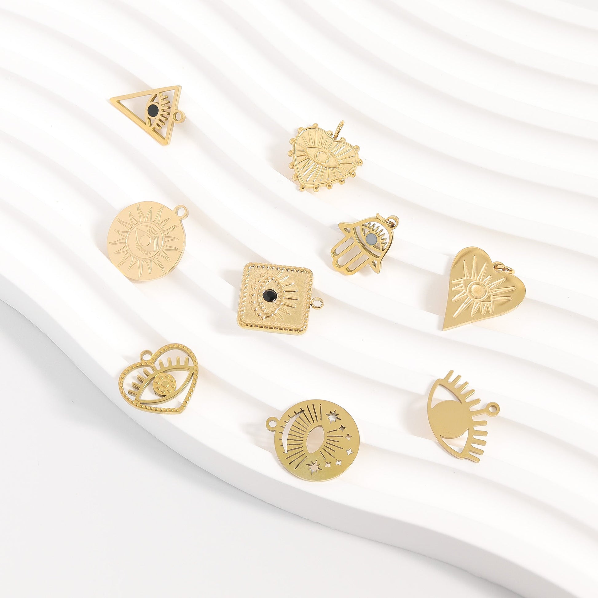 Add a touch of spiritual protection and radiant elegance to your jewelry collection with our 18K Gold PVD Stainless Steel Circle Sun Evil Eye Charm. This striking charm combines two powerful symbols—the evil eye, known for its protective properties, and the sun, a symbol of vitality and positive energy. The charm features a circular design, with the sunburst pattern radiating from the center, surrounding the iconic evil eye, making it a beautiful fusion of meaning and style. Its easy attachment to any chain makes it perfect for unique charm necklaces and bracelets that will last for years to come!